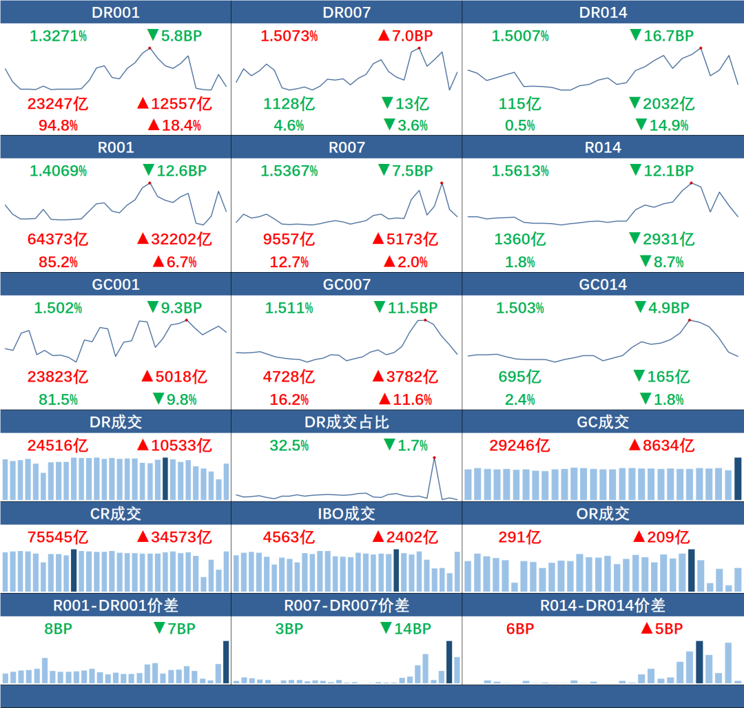 银行间质押式回购市场方面,隔夜品种价跌量涨,DR007与DR014利率倒挂。具体看,DR001、R001加权平均利率下行5.8BP、12.6BP,报1.3271%、1.4069%,成交额分别增加12557亿元、32202亿元;DR007、R007加权平均利率分别上行7.0BP、下行7.5BP,报1.5073%、1.5367%,成交额分别减少13亿元、增加5173亿元;DR014、R014加权平均利率分别下行16.7BP、下行12.1BP,报1.5007%、1.5613%,成交额分别减少2032亿元、2931亿元。